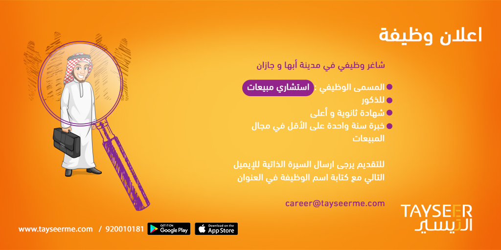 أعلنت شركة التيسير للتمويل عن توفر وظائف شاغرة للرجال للعمل بفروع الشركة بجازان وأبها بمسمتى وظيفي ( استشاري مبيعات ) وذلك حسب التفاصيل الموضحة أدناه: