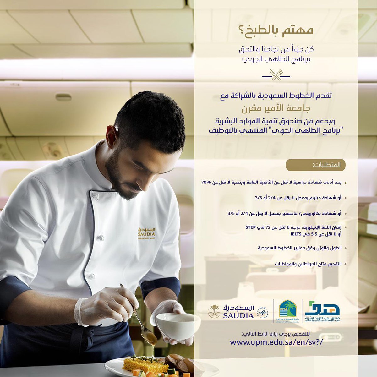 أعلنت الخطوط السعودية بالشراكة مع جامعة الأمير مقرن وبدعم من صندوق تنمية الموارد البشرية " برنامج الطاهي الجوي " المنتهي بالتوظيف وذلك حسب التفاصيل الموضحة أدناه:-