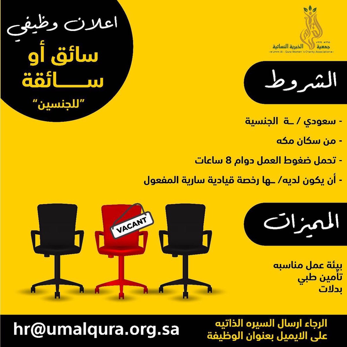أعلنت جمعية أم القرى الخيرية بمكة المكرمة عن توفر وظائف شاغرة (رجال / نساء) إدارية وسائقين واشترطت الجمعية أن يكون المتقدم/ـة سعودي الجنسية وذلك حسب التفاصيل الموضحة أدناه:-