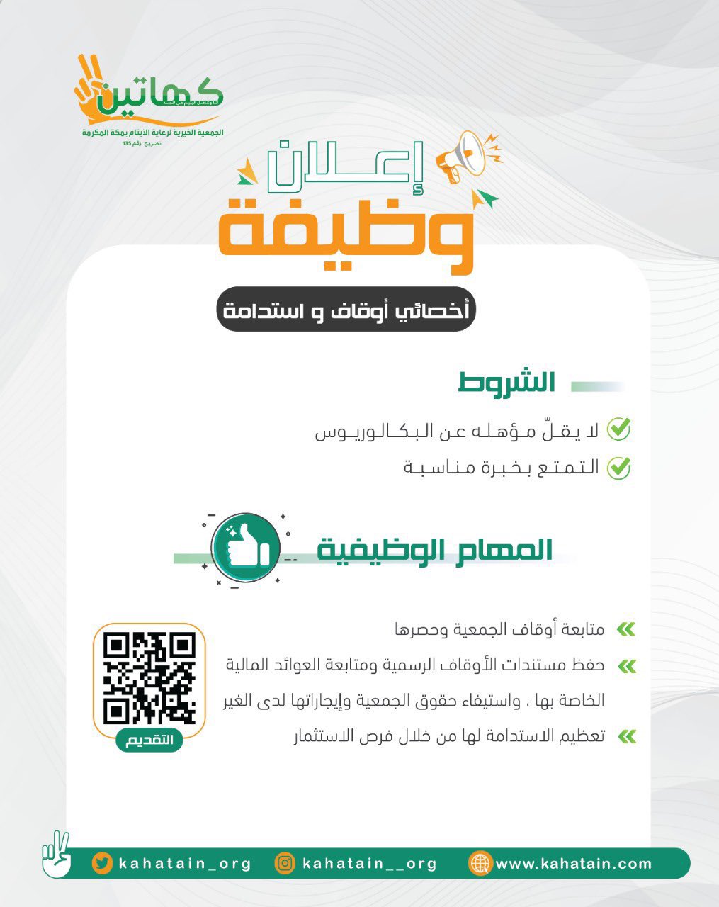 الجمعية الخيرية لرعاية الأيتام بمكة المكرمة (كهاتين) أعلنت عن توفر وظائف إدارية وقانونية شاغرة لحملة البكالوريوس، وذلك وفقاً لبقية الشروط وطريقة التقديم الموضحة أدناه.