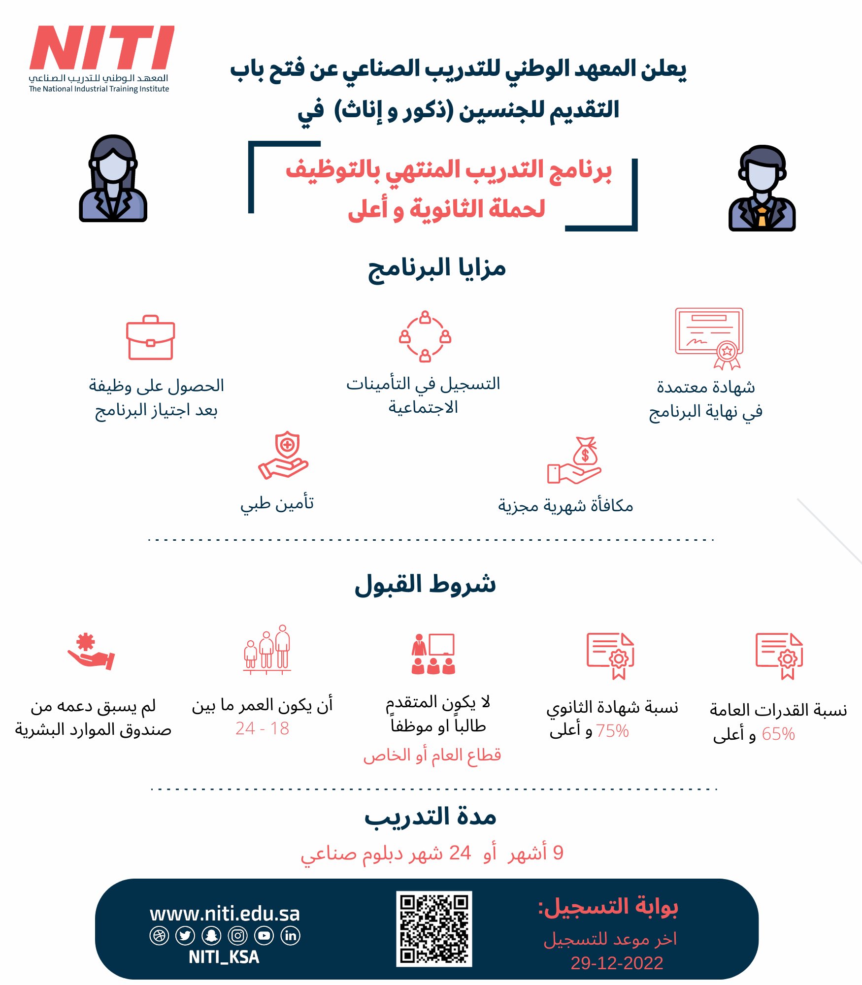 المعهد الوطني للتدريب الصناعي بالأحساء أعلن عن بدء التقديم (للجنسين) في برامج (تدريبية منتهية بالتوظيف)، واشترط المعهد أن يكون المتقدم سعودي الجنسية، وذلك وفقاً للتفاصيل الموضحة أدناه.
