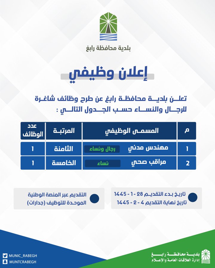 بلدية محافظة رابغ تعلن عن وظائف شاغرة للرجال والنساء عبر جدارات