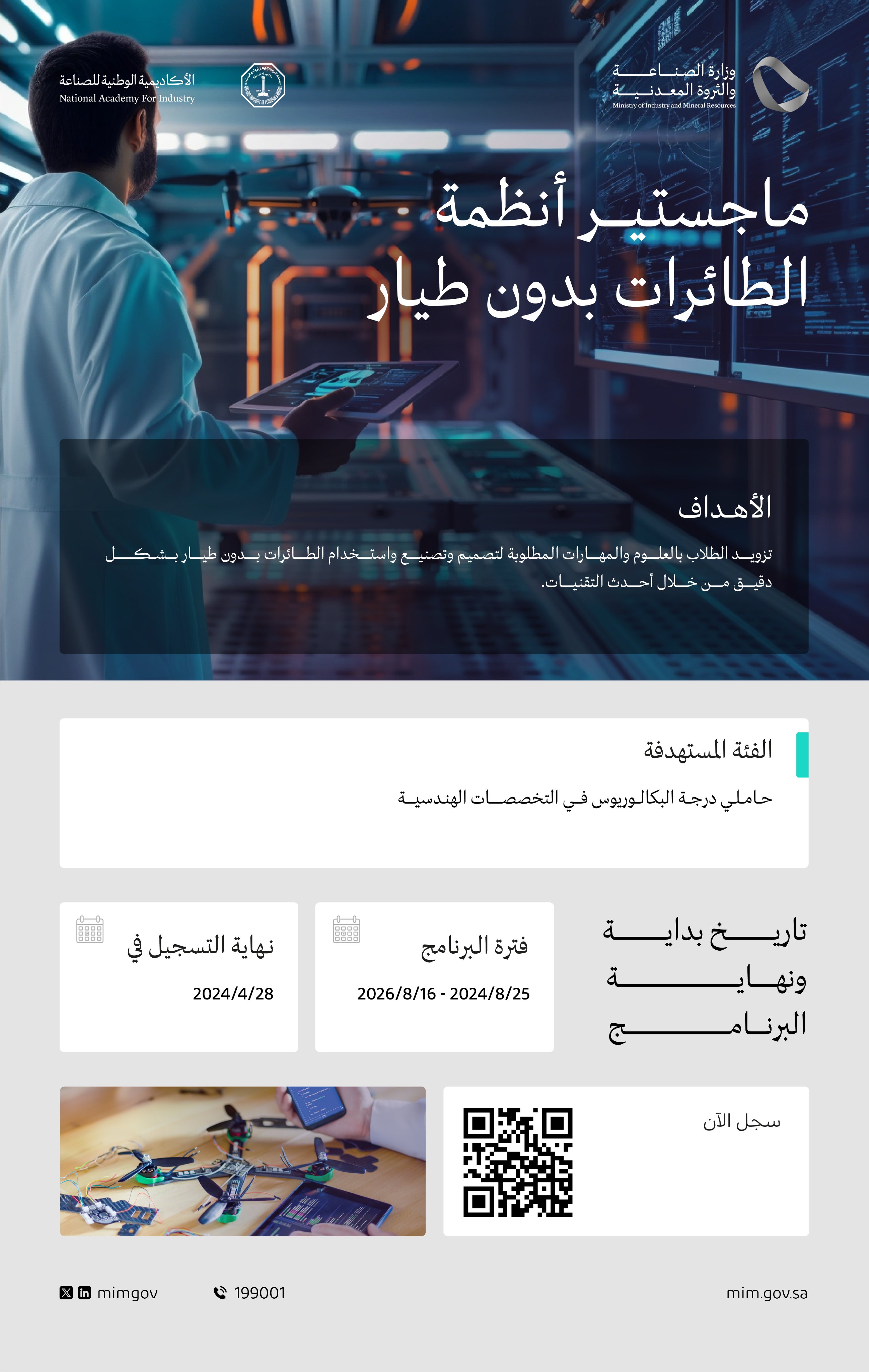 وزارة الصناعة والثروة المعدنية بالتعاون مع جامعة الملك فهد للبترول والمعادن تعلن عن إتاحة التسجيل في ماجستير (أنظمة الطائرات بدون طيار)، وذلك وفقًا للتفاصيل وطريقة التقديم الموضحة أدناه.