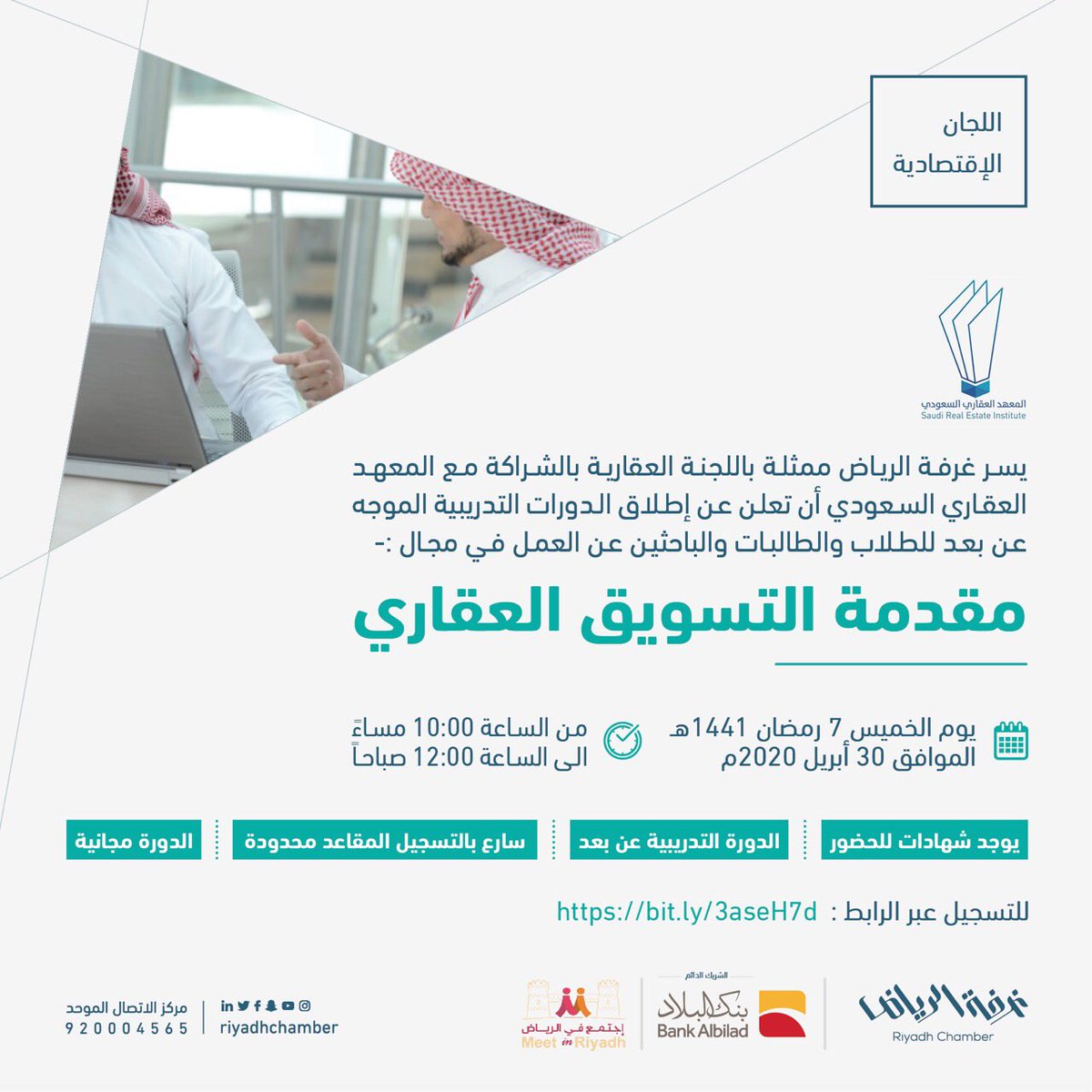 أعلنت غرفة الرياض ممثلة في اللجنة العقارية وبالتعاون مع المعهد العقاري السعودي تعلن 4 دورات مجانية (عن بعد) تستهدف باحث وباحثة عن العمل، وذلك حسب التفاصيل الموضحة أدناه: